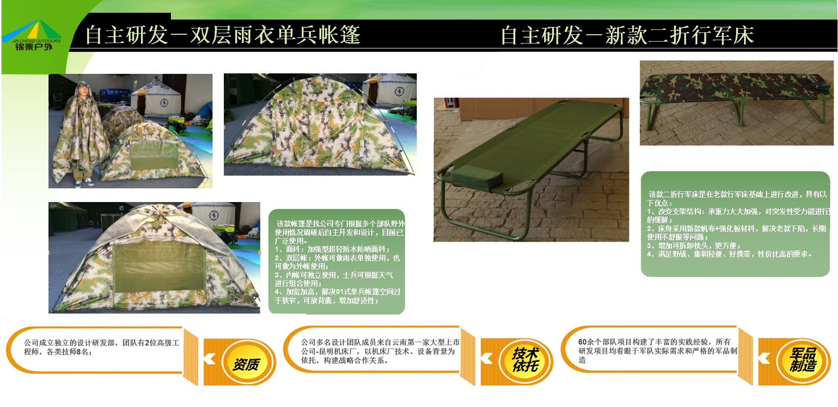 我們?yōu)榱四芤宰罡咝ё畋憬莘绞綖榭蛻?hù)提供需求,現(xiàn)已在昆明市茨壩地區(qū)建立廠房并且已經(jīng)投入生產(chǎn)使用。規(guī)劃在未來(lái) 3 年以?xún)?nèi)對(duì)云南省內(nèi)市場(chǎng)進(jìn)行全面鋪開(kāi),同時(shí)建立高效的運(yùn)作團(tuán)隊(duì),及完善的產(chǎn)業(yè)生產(chǎn)鏈,力求推進(jìn)錦乘戶(hù)外未來(lái)發(fā)展項(xiàng)目,成就戶(hù)外用品行業(yè)中的領(lǐng)軍品牌;以高起點(diǎn)、高服務(wù)水平,為錦乘在戶(hù)外用品行業(yè)中占有一定影響力。為今后進(jìn)軍全國(guó)市場(chǎng)做好充分的資源準(zhǔn)備。