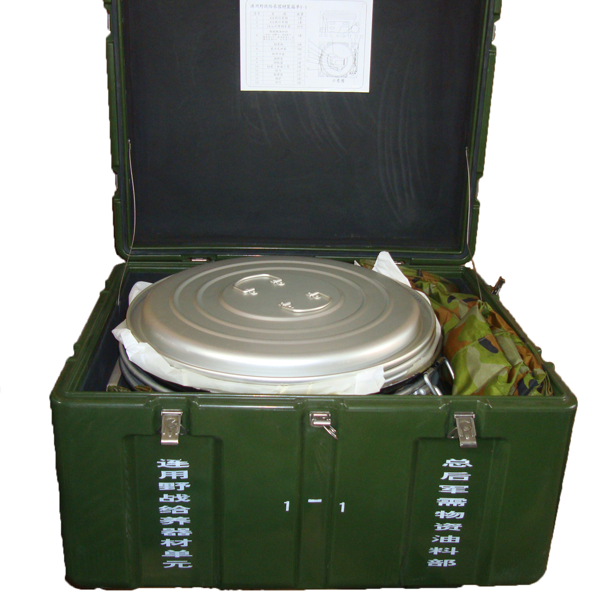 主要構(gòu)件: 45L鋁行軍鍋2個、45L鐵行軍鍋1個、34厘米鋁合金菜盆20個、野戰(zhàn)燃油爐灶1套、行軍背架5付、7.5千克軟體油桶2個、20升送飯(背水)袋5個、行軍鍋罩袋2個、鍋鏟1個、炒勺1個、應(yīng)急燈1個、篜盤1個、燜飯器2個、切菜(和面)布2塊、切菜板2個、菜刀2個、飯勺6個、調(diào)料袋1個、手套2副
